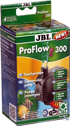 The small JBL ProFlow t 300 pump is specially designed for applications requiring small dimensions and high performance. These pump is ideally suited, for example, as output pump in clear water chambers of bio-filters in freshwater as well as saltwater. The shallow minimum water depth of 4 cm makes these ideal pumps for aqua terrariums or indoor fountains. Depending on the situation and the available space, the mains cable can be routed horizontally or vertically upwards in a hook on the rear panel of the pump. The JBL ProFlow t 300 pump is fully submersible (IPX8) and tested to TÜV/GS. Three space-saving suction cups ensure sturdy mounting. The pumping capacity can be varied within a wide range, so that it can be adapted to virtually any purpose.