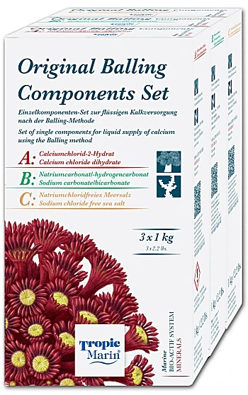 Tropic Marin Original Balling Components Set A/B/C is salt for supply of calcium using the Balling method. Tropic Marin Original Balling Components Set A/B/C are the 3 salt components used in the Balling method and allow an independent dosage of calcium and carbonates adapted to each individual aquarium. The three part method adds calcium chloride dihydrate (part A) and sodium carbonate/sodium bicarbonate (part B), while the addition of sodium chloride free sea salt (part C) maintains the crucial ionic balance in the aquarium water. This balanced calcium dosage creates the best conditions for good growth of corals and coralline algae and avoids the inevitable decrease of important elements seen in two part methods.